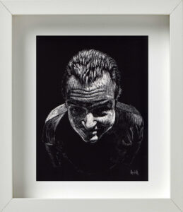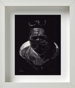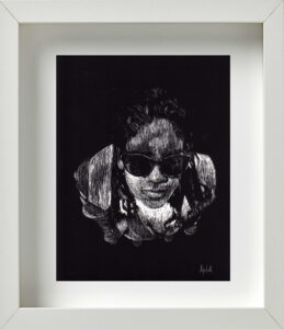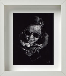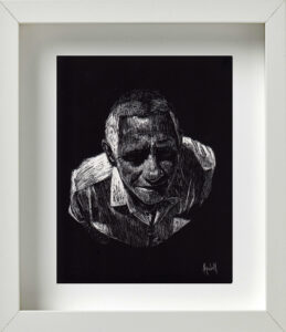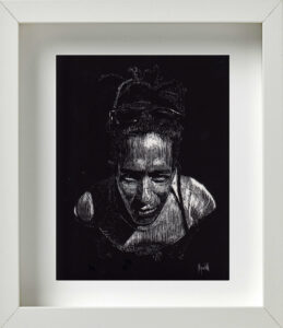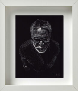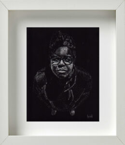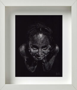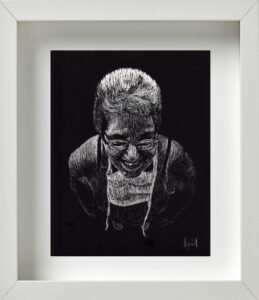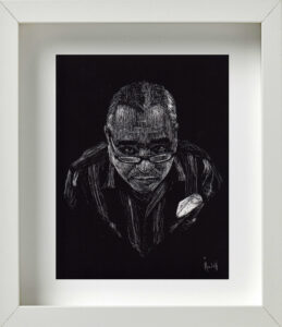 También coincidimos en la idea de que, para la museografía, los retratos debían estar enmarcados todos en blanco; distribuidos en varios grupos por la galería; con una mínima separación entre unos y otros para exaltar ese efecto de concurrencia, de conglomerado. De igual modo pensamos en la alternativa de cubrir de color negro todas las paredes donde serían colgados. Ello crearía una correlación interesante, sugestiva, entre el fondo negro de las paredes, los marcos blancos del cuadro, y la atmósfera oscura del retrato trabajado en scratchboard. Se reforzaría con ello, además, ese cotejo entre el individuo y la colectividad; lo singular y lo cotidiano; la pesadez e ingravidez de las imágenes; entre la naturaleza racional y crítica de la persona, y su sentido de fe, de abstracción espiritual.