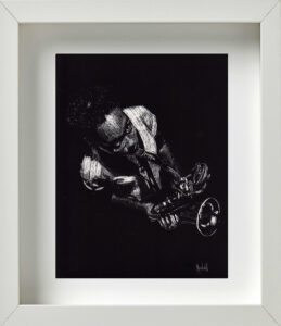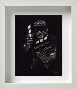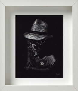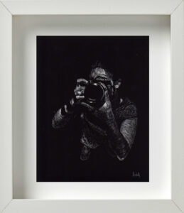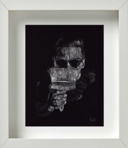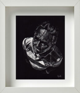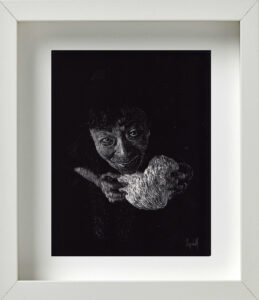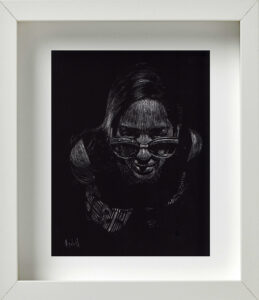 En otro espacio de la galería colgaban unos cuadros de pequeño formato, elaborados mediante el procedimiento del scratchboard; un método que consiste en dibujar con un objeto puntiagudo sobre una cartulina laminada (de color negro en su caso específico), sobre la que se va develando la imagen mediante la acción de rallado. Aunque Alejandro me aclaró que hacía muy poco tiempo que había descubierto los beneficios técnicos de este recurso, el resultado final de las piezas ponía de manifiesto lo rápido que los había llegado a dominar. Eran estas en realidad las obras más acabadas y sugerentes del proyecto Silencio.